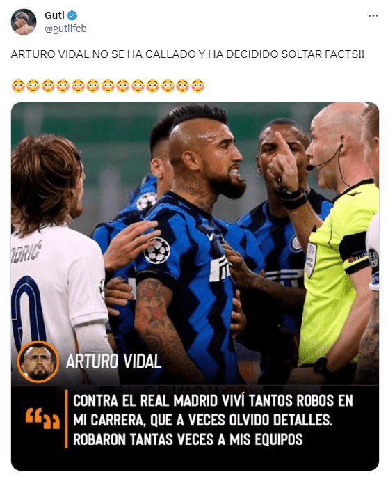 Arturo Vidal tambien aprovechó para apuntar la tensión vivida en una de las temporadas ante el Real Madrid: 'En su estadio fue un partido terrible. La primera vez fue muy extraña... podríamos haber ganado dos Champions… hay un arbitraje tendencioso a favor del Real Madrid en la Champions League', recalcando tajantemente esto en el canal del streamer.