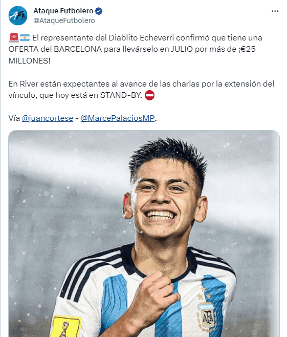 River Plate, su club en Argentina, mantiene un total hermetismo ante las negociaciones, ya que desea renovarle. Pero desde la dirigencia blaugrana han puesto el objetivo sobre la mesa, y han sido contundentes, con una oferta que ya le habrían hecho llegar al representante de Claudio Echeverri situándola en los 25 millones de euros, una fortuna por el jugador y lo cual le puede dejar buenos réditos al club, que dependiendo de la decisión del jugador puede negociar, como agente libre según el tiempo de la negociación según indica el periodista sudamericano Juan Cortese.