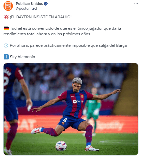 Con todo y ello nuevamente aparece en el radar del Bayern de Múnich el nombre de Ronald Araujo, que de acuerdo a la información reseñada por el medio Sky Alemania, Thomas Tuchel no ve otra opción más que llevarle a la ciudad germana y hacer efectivo su fichaje. Recordemos que el jugador ya ha tenido contacto con la dirigencia, y el entrenador ya ha conocido de primera mano el proyecto deportivo del club.