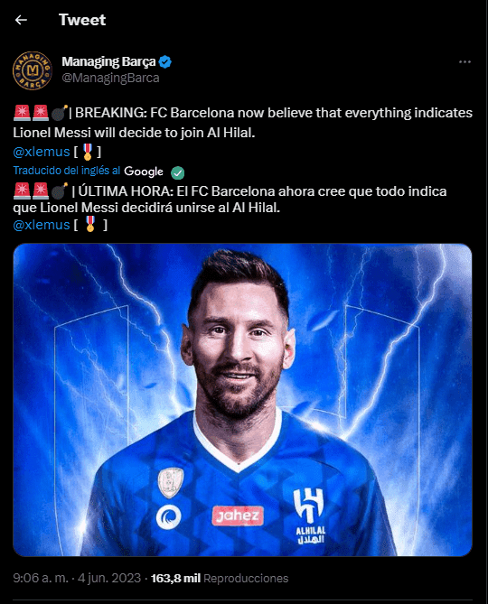 De acuerdo a la información que aporta el periodista Xavi Lemus, en FC Barcelona creen que todo indica que Lionel Messi se inclinará por la propuesta que tiene de Al Hilal FC de Arabia Saudita. La misma en lo económico es casi irresistible con un billón de dólares de contrato y los caminos conducen a que se inclinaría por esa propuesta.