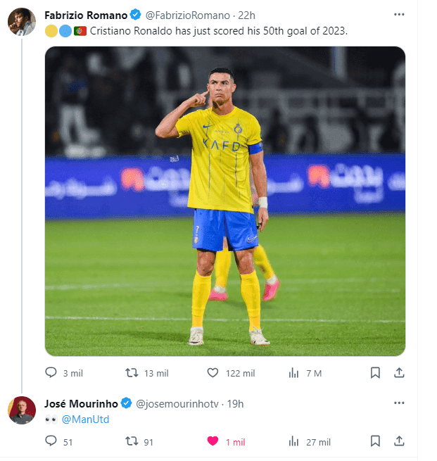 En las redes sociales, José Mourinho etiquetó al Manchester United en una publicación de Fabrizio Romano donde destaca la cantidad de goles que tiene Cristiano Ronaldo y que seguramente le vendrían bien al equipo inglés actualmente, ya que no tienen un líder y están sufriendo porque nadie saca la cara cuando más lo necesitan.