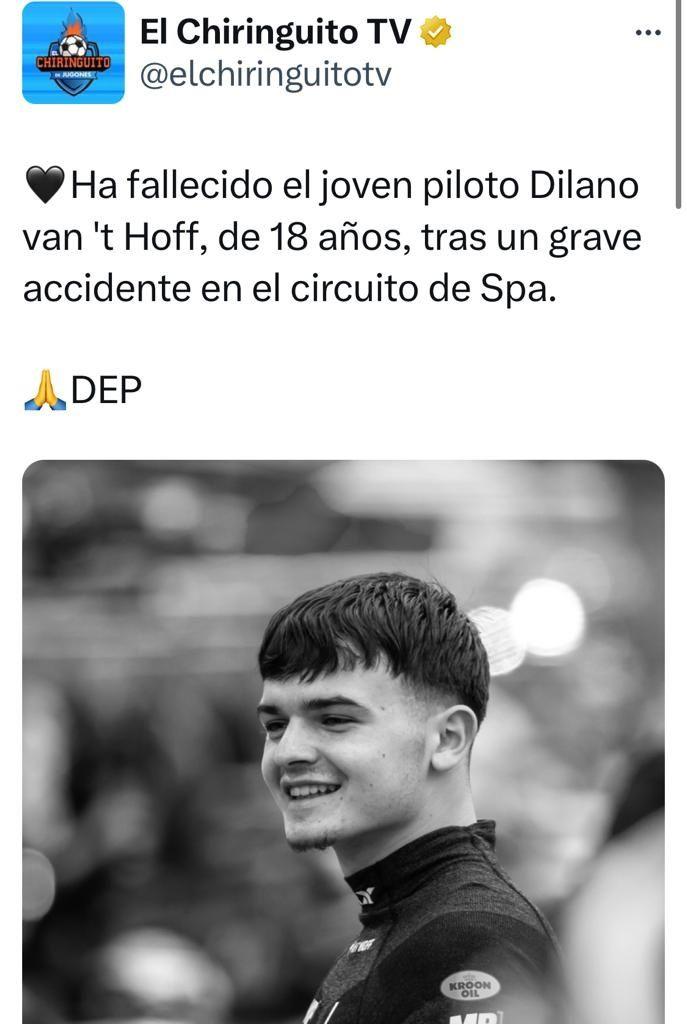 La muerte de Dilano van't Hoff fue muy parecida al último antecedente fatal en este circuito de Bélgica.. La muerte del joven neerlandés recordó a ese accidente de 2019 que le costó la vida al francés Anthoine Hubert, en este mismo circuito, también siendo embestido por un rival al quedar en posición perpendicular en el trazado.