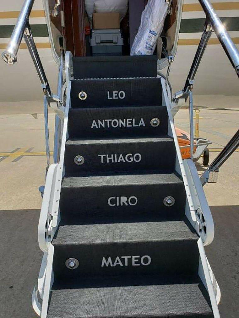 Al abrirse las escaleras de la gran nave, ya está claro a quien pertenece el lujoso jet privado en el que se desplaza Messi y su familia. Cae una pequeña escalera que invita a abordar la nave con la leyenda "Leo, Antonella, Thiago, Ciro y Mateo",. Los nombres de cada integrante de la familia del astro rosarino aparecen en el ingreso al avión. Además de ese detalle, se incluye el número 10 estampado en la cola de la nave, que posee un interior a puro lujo.