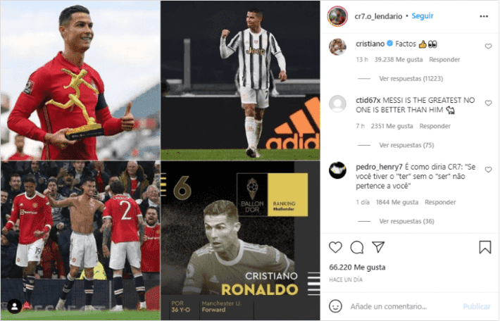 Según informa la página Bolavip, CR7 comentó "hechos" en una publicación de Instagram de una fanpage en la que destacaba sus logros en la temporada y criticaba al argentino por haber obtenido el Balón de Oro este año. Con la palabra "Factos" en portugués más un pulgar hacia arriba y un emoji de dos ojos, Cristiano quiso remarcar que estaba de acuerdo en todo lo que dijo la publicación.