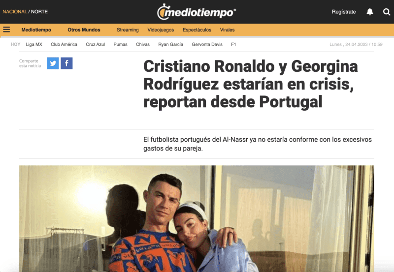 Y es que Cristiano Ronaldo estaría inconforme porque Georgina Rodríguez pasaría gastando dinero en los centros comerciales de Arabia. "Daniel Nascimento, colaborador de CMTV, reveló que Ronaldo tampoco estaría a gusto con el excéntrico estilo de vida que maneja la madre de dos de sus hijos", mencionó el medio Mediotiempo.