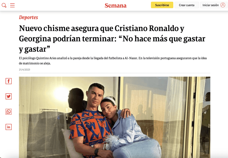 Se ha destapado una polémica entre Georgina Rodríguez y Cristiano Ronaldo en Arabia, de acuerdo a información de Semana, quienes informaron: “psicólogo Quintino Aries analizó a la pareja desde la llegada del futbolista a Al-Nassr. En la televisión portuguesa aseguraron que la idea de matrimonio se aleja”.