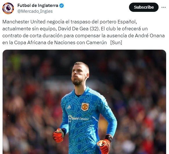 Pero ante la ausencia que habrá de Onana, quieren llevar a David De Gea al Manchester United. De acuerdo a Sun: “Manchester United negocia el traspaso del portero Español, actualmente sin equipo, David De Gea (32 años). El club le ofrecerá un contrato de corta duración para compensar la ausencia de André Onana en la Copa Africana de Naciones con Camerún”.