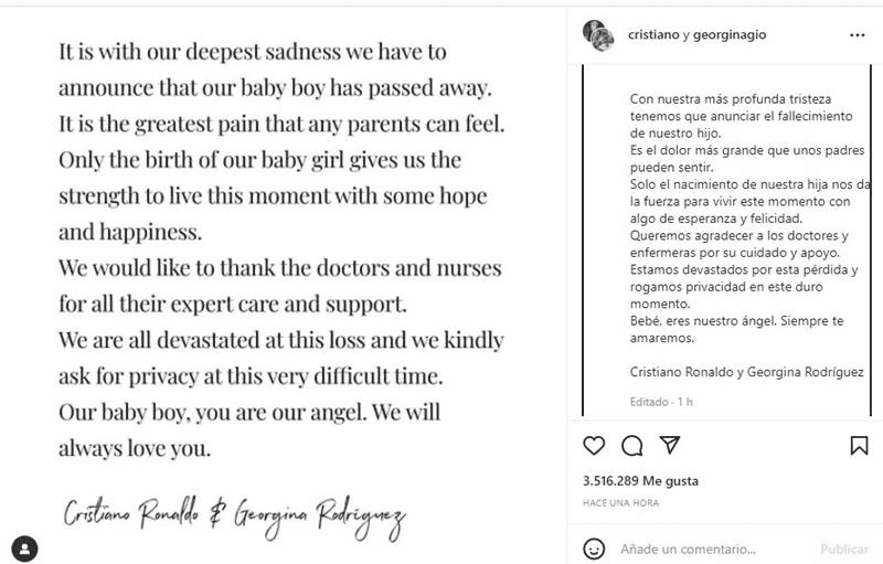 Cristiano Ronaldo y Georgina Rodríguez iban a ser padres de mellizos como ellos mismos anunciaron hace unos meses. Sin embargo, el pasado lunes, ambos informaron la triste noticia del fallecimiento de uno de los bebés, precisamente, el niño: “con nuestra más profunda tristeza tenemos que anunciar el fallecimiento de nuestro hijo. Es el dolor más grande que unos padres pueden sentir”, han comenzado su publicación en un comunicado emitido a través de sus redes sociales.