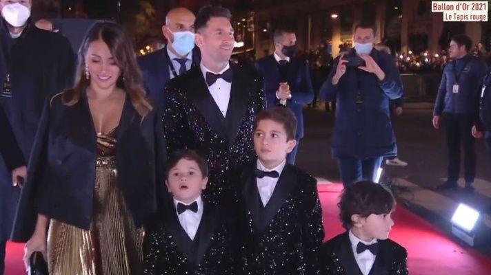 El astro argentino se bajó de una enorme limusina junto a su esposa Antonela Rocuzzo y sus tres hijos, y sorprendió debido al llamativo smoking brilloso que llevaba y que además estaba perfectamente combinado con el de sus hijos, Thiago, Mateo y Ciro Messi.