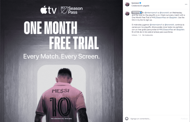 Lionel Messi compartió esta emocionante noticia con sus seguidores a través de su cuenta de Instagram: "El miércoles jugamos Inter Miami vs. Toronto FC, continúa la carrera por los playoffs. Ahora, podés mirar todos los partidos con un mes gratis para probar el MLS Season Pass en AppleTV. En el link de mi bio está el enlace para suscribirse".