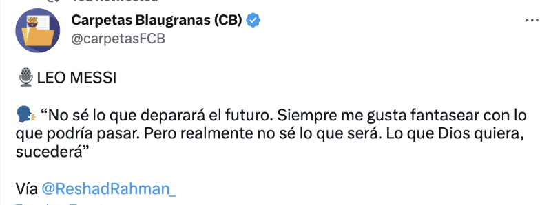 De acuerdo al periodista, cuando le preguntaron a Lionel Messi sobre lo que le deparará el futuro, explicó: “No sé lo que deparará el futuro. Siempre me gusta fantasear con lo que podría pasar. Pero realmente no sé lo que será. Lo que Dios quiera, sucederá”. De ese modo le ha dejado una puerta abierta al no regresar.