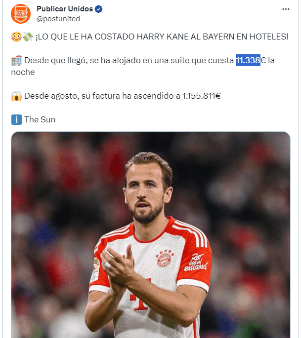 Pero así como unas son dolorosas, otras son buenas, y es que en las últimas horas una información divulgada por el popular rotativo inglés, The Sun ha mencionado la amplia deuda con la que se encuentra el cuadro bávaro por cuenta del hospedaje de Kane, el cual aún no cuenta con vivienda propia en Múnich. Esto ha llevado a que el club le pague una suite en un hotel, que por valor diario tiene un costo estimado de 11.338 euros por noche, una cifra que al día de hoy puede compararse en su momento al costo estimado de Joselu, por el cuadro merengue una vez salió del Espanyol.