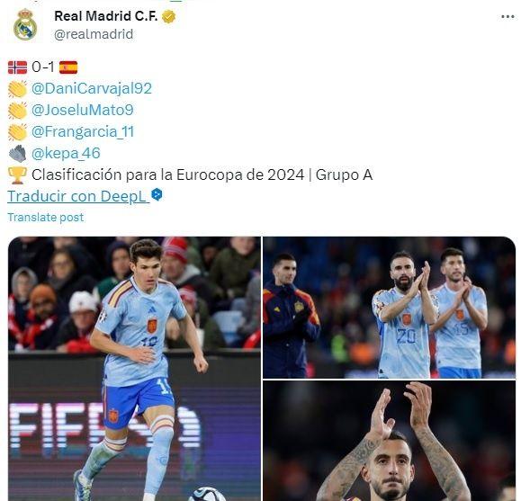 Incluso la cuenta oficial del Real Madrid ignoró a Gavi por alcanzar el tanto y meter a la Selección de España en la Eurocopa, sino que postearon a sus jugadores que fueron convocados por Luis de la Fuente y les extendió su felicitación por el logro conseguido. Los jugadores fueron Dani Carvajal, Joselu, Fran García y Kepa Arrizagalaga.