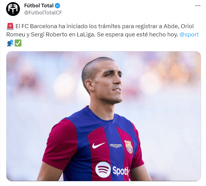 En el transcurso del día se espera que el FC Barcelona resuelva las inscripciones de tres de sus nuevos jugadores, entre los que destaca Oriol Romeu, quien está de vuelta en la institución y será clave en la plantilla de Xavi desde esta primera fecha. Romeu ha sido una pieza que ha destacado en la pretemporada y el entrenador se aseguraría tener en plantilla para fortalecer la parte medular del esquema táctico en su primera salida liguera.