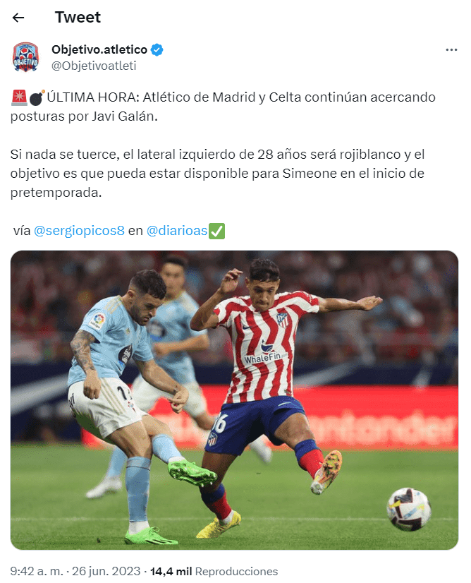 En este contexto, Atlético de Madrid apunta a un refuerzo mucho más cercano en cuanto a las cifras. De acuerdo a la información de Sergio Picos de diario AS, Javi Galán se aproxima como fichaje. El Colchonero y el elenco de Vigo están rumbo a poder lograr un acuerdo para que el jugador de 28 años llegue en este mercado.