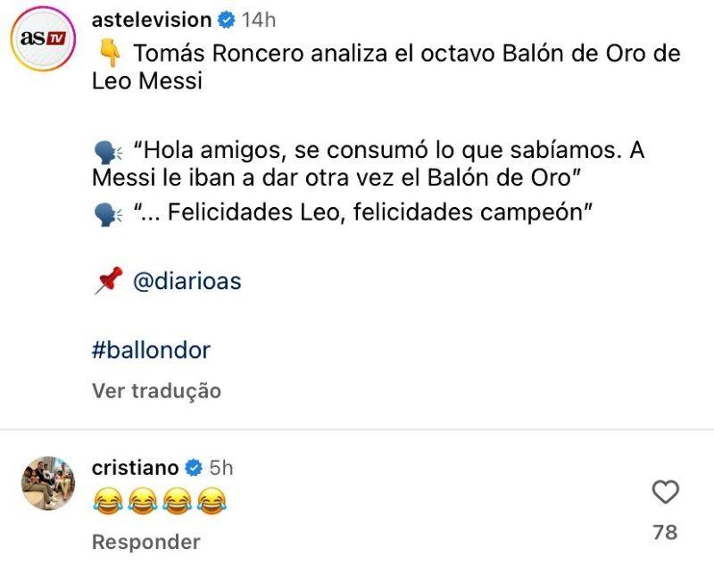 Cristiano Ronaldo lanzó una burla a un posteo donde hablaron del octavo Balón de Oro de Lionel Messi. Y es que Tomás Roncero en Diario AS dio su análisis sobre el nuevo premio del argentino, que no lo consideró justo, incluso que debería tener menos porque, desde su punto de vista, se los robaron a Xavi, Iniesta, Lewandowski y Haaland.