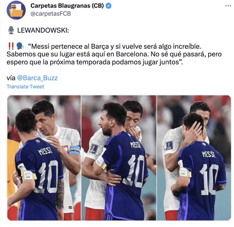 Le preguntaron a Robert Lewandowski sobre su criterio en torno al posible regreso de Lionel Messi, reaccionando de manera positiva y alegre ante la posibilidad que llegue al club. “Messi pertenece al Barça y si vuelve será algo increíble. Sabemos que su lugar está aquí en Barcelona. No sé qué pasará, pero espero que la próxima temporada podamos jugar juntos”.