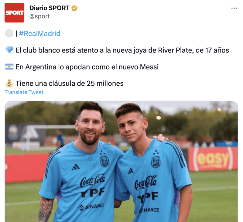 Claudio Echeverri, conocido también en el mundo del fútbol como Diablito, se ha puesto en el radar del Real Madrid y de acuerdo a información de Diario Sport, son 25 millones de dólares los que deben pagar a River Plate, que es dueño de sus derechos deportivos. El joven volante ya ha asombrado al argentino Messi.