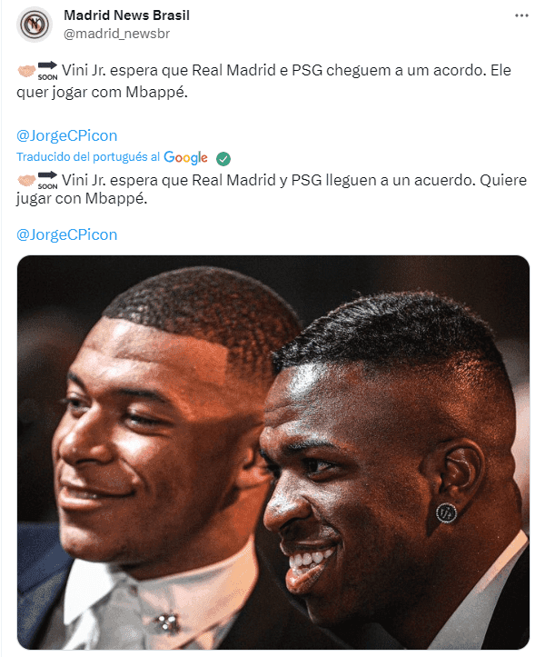Se ha conocido extra futbolisticamente el anhelo del jugador de la selección brasileña para con Kylian Mbappé, a quien ya lo ve como su compañero en el Real Madrid y donde manifiesta su absoluto deseo de que ambas dirigencias, tanto la del PSG, como la del Real Madrid cierren el acuerdo y se de el fichaje del año en el mundo del fútbol.