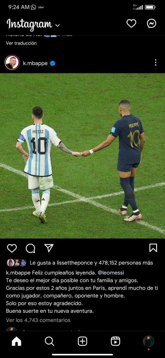 De esta manera, Kylian Mbappé vuelve a dejar muy en claro que la relación entre él y Lionel Messi es más que buena, enterrando todos los supuestos sobre peleas huevos que tuvieron cuando compartieron vestuario en PSG. Antes había sido el propio argentino quien le había dado su muestra de afecto, cerrando definitivamente la polémica.