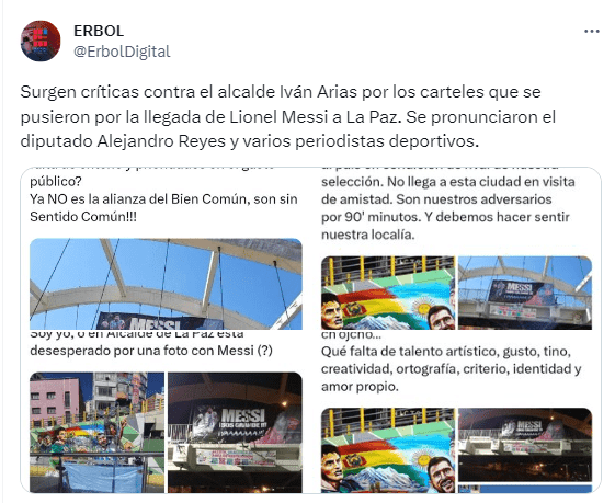 Muchas críticas se han generado en la capital boliviana a raíz de las acciones realizadas por su alcalde, Iván Arias quien ha destinado algunos de los recursos para actividades alrededor del recibimiento de la Selección Argentina ubicando carteles del campeón del mundo y actual jugador del Inter de Miami en algunos sectores de la ciudad.