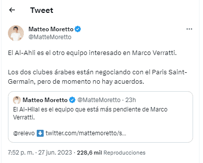 Mientras Antoinne Griezmann decidió quedarse por amor a los colores de Atlético de Madrid y rechazar una mega propuesta desde medio oriente, Marco Verratti esta en la mira del fútbol árabe que tiene dos firmes pretendientes para quedarse con su pase: Al-Ahli y Al-Hilal son los candidatos a poder ficharlo.