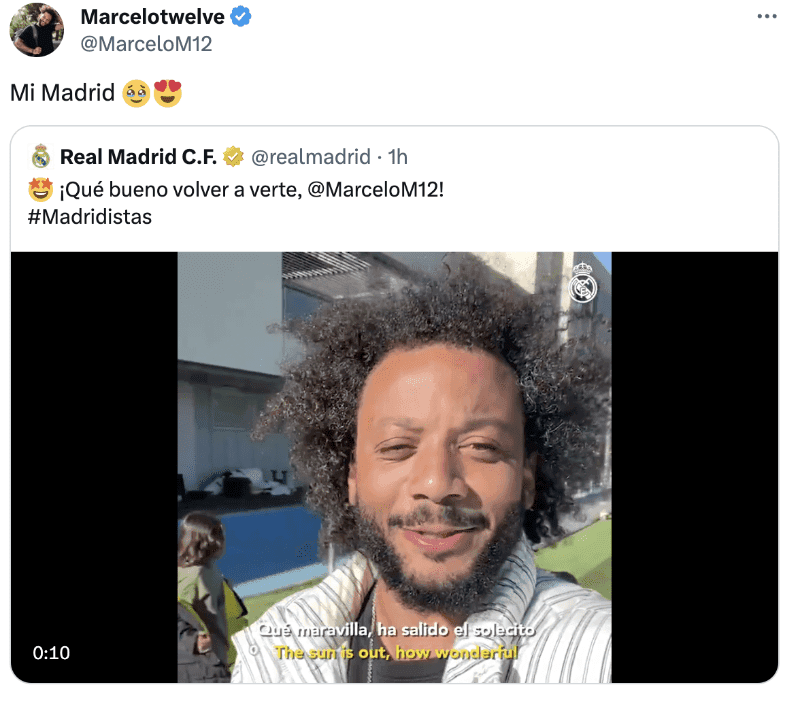 Por medio de las redes sociales publicaron en el Real Madrid el mensaje que dejó Marcelo a todos los hinchas. El brasileño estuvo en el predio de entrenamiento del equipo blanco, donde saludó a sus ex compañeros, entre ellos Nacho. También le regaló la camiseta de Fluminense a Carlo Ancelotti, con la que jugó el Mundial de Clubes.