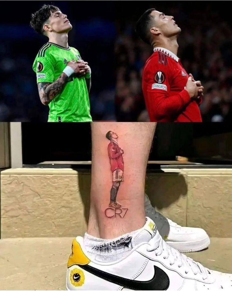 Sin embargo, a pesar de su admiración por Messi, Garnacho también ha mostrado su devoción por Cristiano Ronaldo de una manera muy especial. Se tatuó una imagen de la celebración del luso después de marcar su primer gol como profesional en el Manchester United. Esta celebración consiste en entrelazar los dedos de las manos a la altura del estómago y cerrar los ojos. Además, el tatuaje incluye las iniciales "CR7" debajo de la imagen.