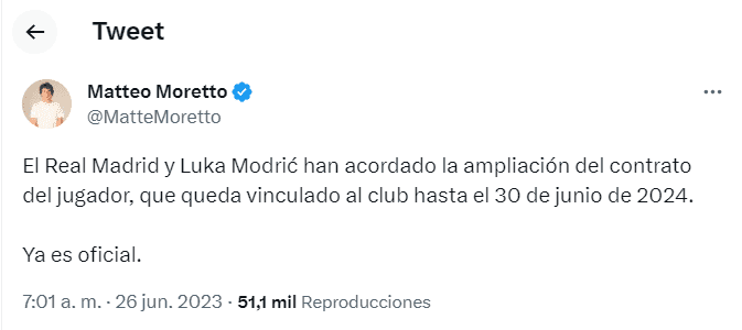 De acuerdo a la información de Matteo Moretto del medio Relevo, Luka Modric seguirá siendo jugador de Real Madrid tras llegar a un acuerdo con los directivos de Real Madrid para extender su contrato. La idea se venía barajando y ambas partes decidieron estirar el vínculo hasta el 30 de junio de 2024.