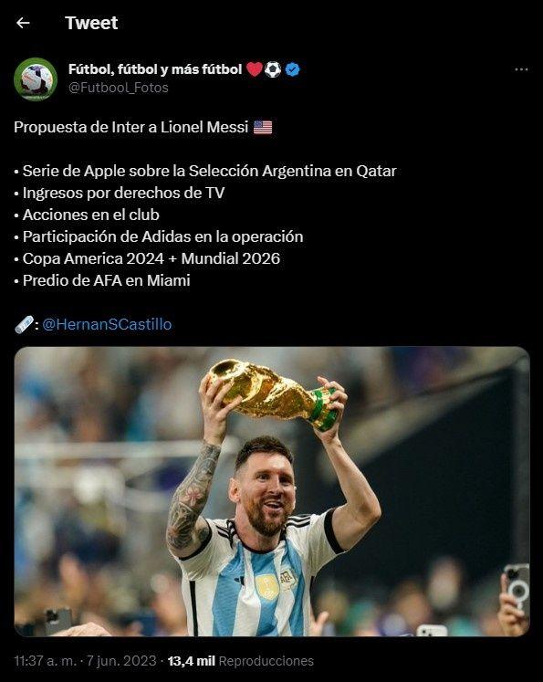 Según informa el periodista de TyC Sports Hernán Castillo el Inter de Miami le dará a Lionel Messi lo siguiente. Una serie documental en Apple TV sobre el campeonato del mundo obtenido por Argentina, ingresos por derechos televisivos, acciones en el club y preparación para la Copa América 2024 y la Copa Mundial 2026.
