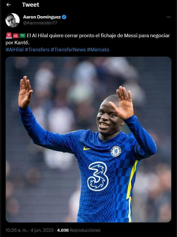 El apuntado por Al Hilal FC es el mediocampista de Francia N'golo Kante, a quién FC Barcelona buscó también como refuerzo. El volante central se encuentra en Chelsea, donde no cuenta con los minutos que desea, pero con ese contrato el próximo 30 de junio del 2023 y quedaría como agente libre. Tras tener el pase en su poder, el mediocentro buscará un club que le de rodaje.