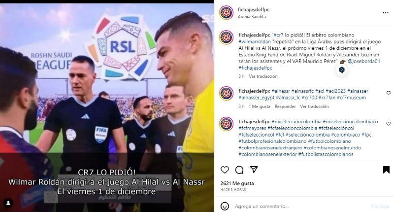Para ello cuida cada detalle, aunque llamó la atención el pedido que hizo, de acuerdo a información del portal Fichajes del FPC: "CR7 lo pidió. El árbitro colombiano Wilmar Roldán repetirá en la Liga Árabe, pues dirigirá el juego Al Hilal vs Al Nassr, el próximo viernes 1 de diciembre en el Estadio King Fahd de Riad. Miguel Roldán y Alexander Guzmán serán los asistentes y el VAR Mauricio Pérez".