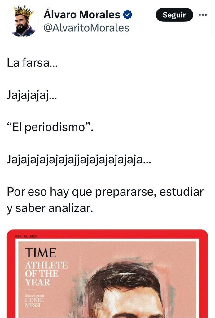 Para el periodista mexicano, Álvaro Morales, ninguneó a Lionel Messi y en su cuenta personal X escribió: “La farsa… Jajajajaj… “El periodismo”. Jajajajajajajajjajajajajajaja… Por eso hay que prepararse, estudiar y saber analizar”. Para Morales, el astro argentino es sobrevalorado y no debería tener tantos trofeos individuales.