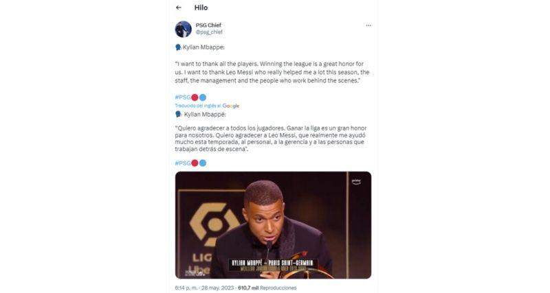 Durante toda la estadía en PSG se habló de un supuesto cortocircuito entre Kylian Mbappé y Lionel Messi, las dos súper estrellas del equipo. Una vez consumado el título de liga el delantero, el francés tuvo unas palabras para con el argentino que decidió faltar a la ceremonia de festejos y fue a un recital de Coldplay en España.