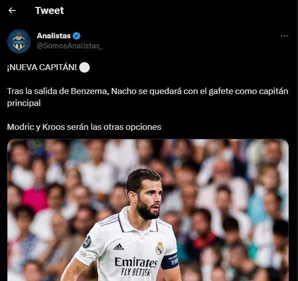 Aquí se da una situación muy particular, y es que Nacho, habitualmente, no es parte del equipo titular, por lo que al él estar en el banquillo de suplentes la cinta le corresponde al más cercano a su puesto en la lista de capitanes y que esté en el campo, por supuesto. Ese nombre es el de Luka Modrić, por lo que será él a quien veamos habitualmente con el brazalete de capitán.