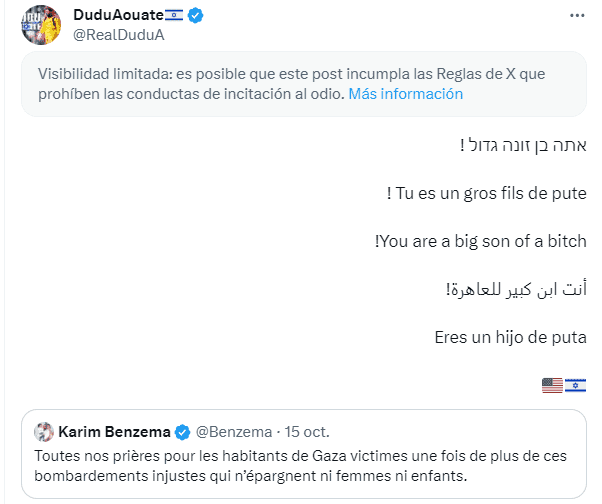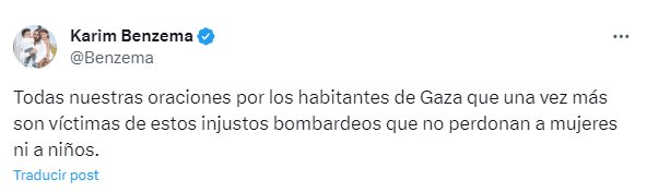 Un mensaje de Karim Benzema haciendo parte del apoyo al pueblo palestino y la solidaridad con la que el atacante francés desea mediante la fe la resolución del conflicto para los habitantes de gaza ha despertado todo tipo de reacciones, entre ellas las de un exfutbolista israelí a quien Benzema enfrento en LaLiga cuando él vestía la camiseta del Real Madrid causando el repudio de muchos fans en todo el mundo.