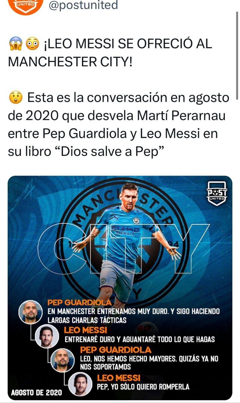 Lionel Messi pidió ser parte del Manchester City y cuando habló con Pep Guardiola le dijo que se esforzaría para romperla en el plantel sin embargo el entrenador lo habría considerado como pasado de edad para aguantar el planteamiento táctico que tienen en el plantel. Es por ello que el astro argentino no firmó con los Ciudadanos.