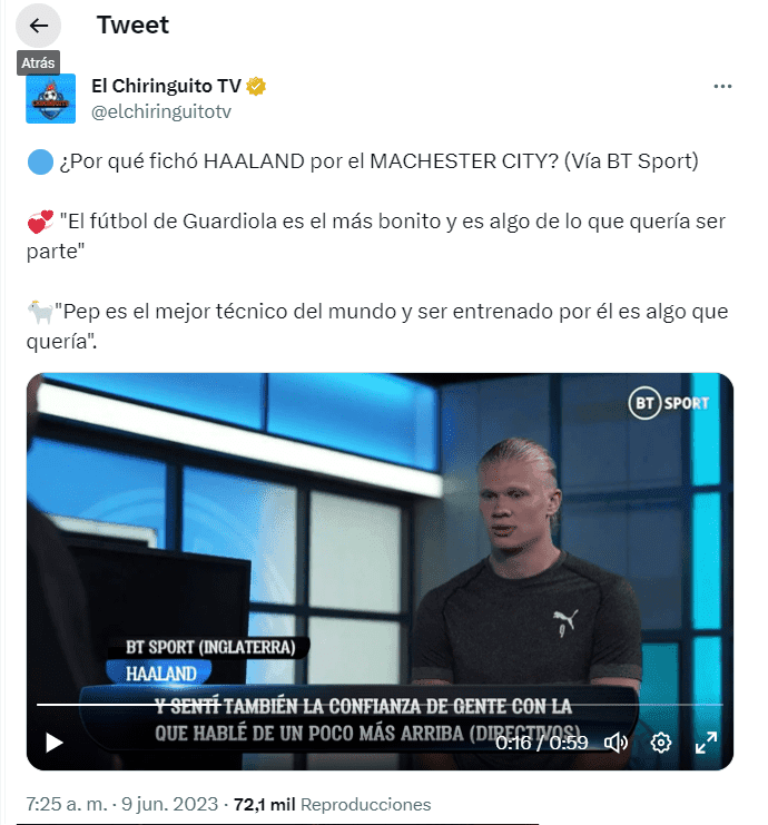En una entrevista brindada al medio BT Sports, el noruego Erling Haaland admitió que la elección para Manchester City tiene que ver con el fútbol vistoso que pregona en el equipo que comanda Pep Guardiola, a quien además ponderó como el mejor director técnico de todo el mundo. Según sus palabras, para el delantero es un verdadero privilegio ser dirigido por el director técnico español.
