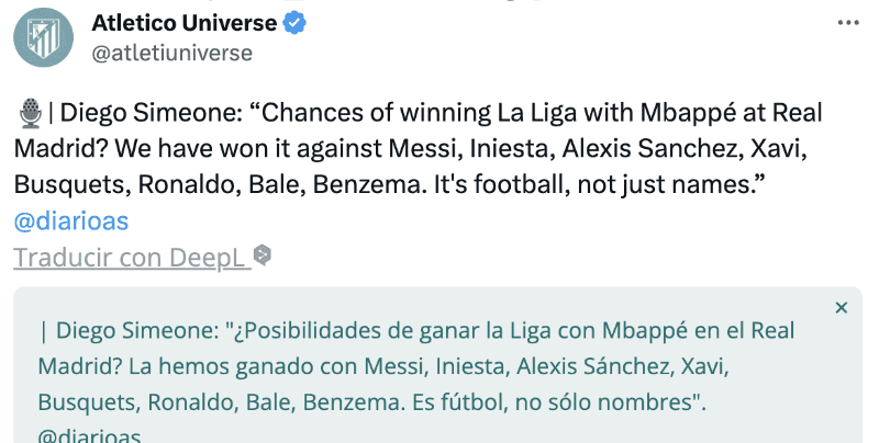 “¿Posibilidades de ganar la Liga con Mbappé en el Real Madrid? La hemos ganado con Messi, Iniesta, Alexis Sánchez, Xavi, Busquets, Ronaldo, Bale, Benzema. Es fútbol, no sólo nombres”, dijo Diego Simeone en entrevista con los medios de comunicación españoles. Con esto dejó claro que no es el jugador el que hace al equipo.