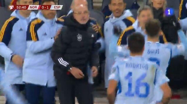 Fueron varios minutos los que el referí estuvo charlando con la gente del VAR, dirimiendo si la presencia de Gavi había estado en línea antes de disparar al arco, o si había hecho cortina al portero de Noruega. Finalmente le dieron el gol a la Selección de España y Luis de la Fuente levantó los puños y luego se unió con Gavi en un abrazo para celebrar el gol.