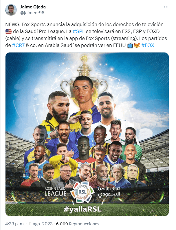 Según la información de Felipe Cárdenas y Alex Brodie para The Athletic, la Saudi Pro League de Arabia Saudita empezará a verse en Estados Unidos a través de la cadena de Fox Sports. El objetivo será captar también al público norteamericano debido a la fuerte adquisición de estrellas que ha tenido en este mercado de pases.