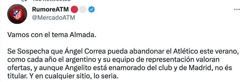 Para el Cholo es plan B. Ángel Correa, quien tiene un valor de mercado de 35 millones de euros según Transfermarkt, y las ofertas llegarían en el próximo mercado de fichajes. El argentino fue campeón del mundo al ser seleccionado por Lionel Scaloni para el Mundial de Qatar 2022, lo cual su valor creció y su nivel futbolístico continúa en mejora.