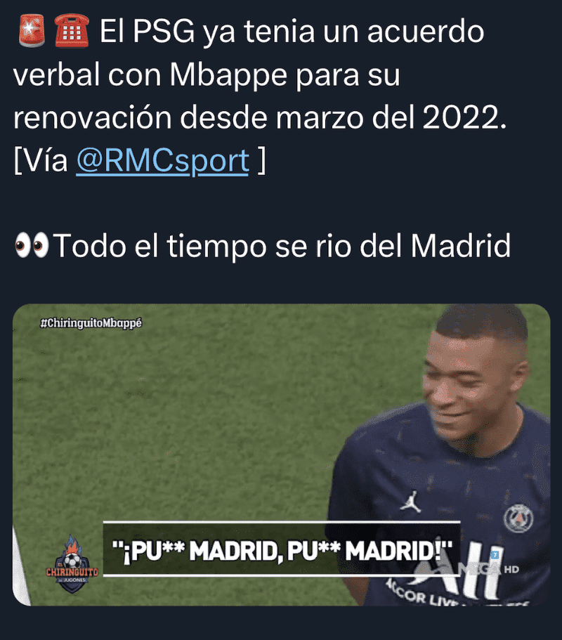 Pese a que el Real Madrid quiso hace un esfuerzo grande por contratar a Kylian Mbappé, este los insultó y quedó captado en cámaras. Con palabras fuertes, de acuerdo a lo que dejó ver El Chiringuito, se refirió el francés quien ahora solamente está concentrado en rendir en el PSG y también en la Selección de España.