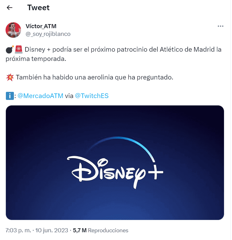 Según la información que aporta el sitio Mercado ATM, la empresa mundial Walt Disney Company está muy próximo a desembarcar en Atlético de Madrid como uno de los sponsors de patrocinio para la próxima temporada. Además, hay una fuerte aerolínea aérea también que puede sumarse como otro sponsor.