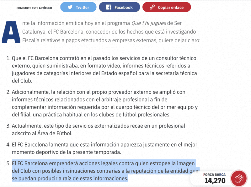 “El FC Barcelona emprenderá acciones legales contra quien estropee la imagen del Club con posibles insinuaciones contrarias a la reputación de la entidad que se puedan producir a raíz de estas informaciones” ha decidido el directorio de FC Barcelona, comandado por Joan Laporta, ante los eventos sucedidos.