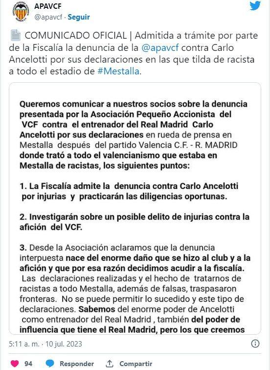 Resulta ser que al finalizar aquel encuentro, Carlo Ancelotti declaró que en determinado momento todo Mestalla comenzó a gritarle “mono” a Vinicius. Según la entidad valenciana esto es mentira, ya que alegan que lo que le gritaron fue “tonto” y no lo otro; Valencia consideró dichas declaraciones como un acto de difamación y elevó una denuncia ante la Fiscalía por injurias.