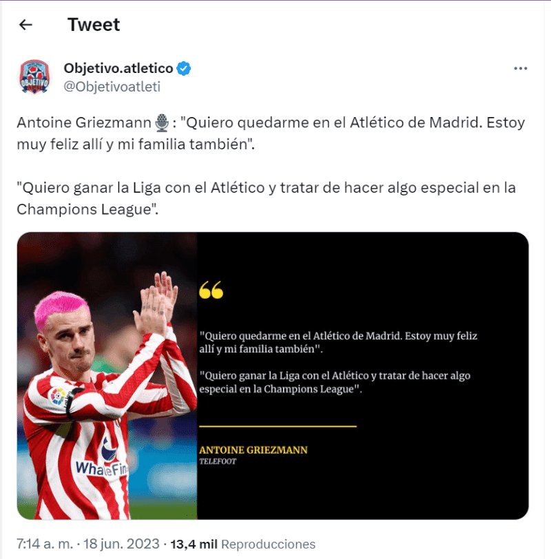 Entrevistado por Telefoot, Antoine Griezmann confirmó que su deseo es quedarse en Atlético de Madrid la próxima temporada y anhela poder lograr el título de La Liga nuevamente con los colores rojiblancos que lleva en la piel. Además, confirmó y su deseo es hacer un buen papel en la próxima Champions League.