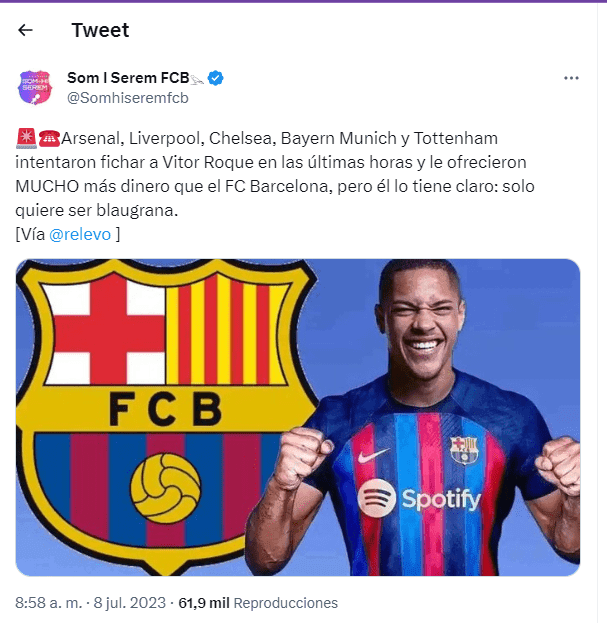 De acuerdo a la información de Relevo, Vitor Roque pudo ganar 10 millones de euros por temporada en clubes gigantes como Chelsea de Inglaterra o Bayern Munich de Alemania, sin embargo su deseo deportivo pudo más y terminó aceptando FC Barcelona por una cifra mucho menor para su cuenta bancaria.