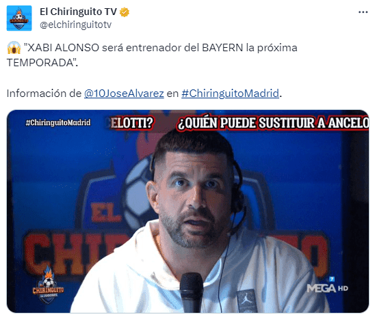 José Álvarez en El Chiringuito anunció un nuevo destino para la opción más cercana al madridismo tras la de Ancelotti, y es que según menciona el comunicador, Xabi Alonso tendría todo acordado para marcharse, no a Madrid sino a Múnich, donde tomaría las riendas del Bayern, de irregular campaña en la actualidad con Thomas Tuchel, y que aún no termina de cerrar a la directiva por su irregular juego y síntoma de resultados.