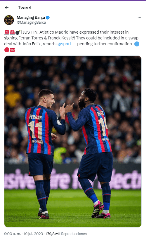 De acuerdo a la información que aporta diario Sport, Atlético de Madrid quiere a Ferrán Torres y a Franck Kessié, los dos sin lugar en la consideración de Xavi Hernández para la inminente temporada Culé. El español tiene un valor de mercado de 55 millones de euros mientras que el marfileño cuesta 50 millones, cerrando así un valor final de 105 millones.